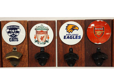 Made from Merbau Wood with a coaster of your choice and metal bottle opener attached to the bottom.